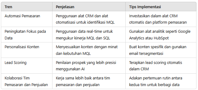 Di era digital, tren dalam pengelolaan MQL dan SQL terus berubah. Berikut adalah beberapa tren penting yang perlu diperhatikan oleh setiap pemasar digital.