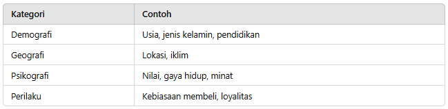 - Target audiens adalah kelompok orang yang diidentifikasi sebagai penerima utama dari pesan pemasaran Anda.