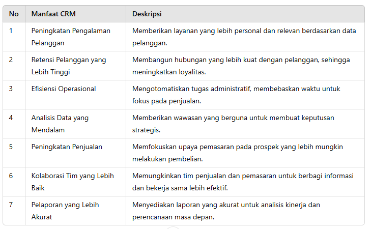 - Manfaat CRM: Nama manfaat yang diperoleh dari penggunaan CRM.