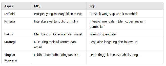 - SQL adalah prospek yang telah menunjukkan niat untuk membeli dan telah disaring oleh tim penjualan.