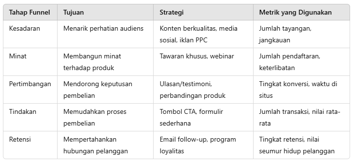 - Analisis Data: Selalu analisis data dari setiap tahap funnel untuk mengidentifikasi area yang perlu ditingkatkan.