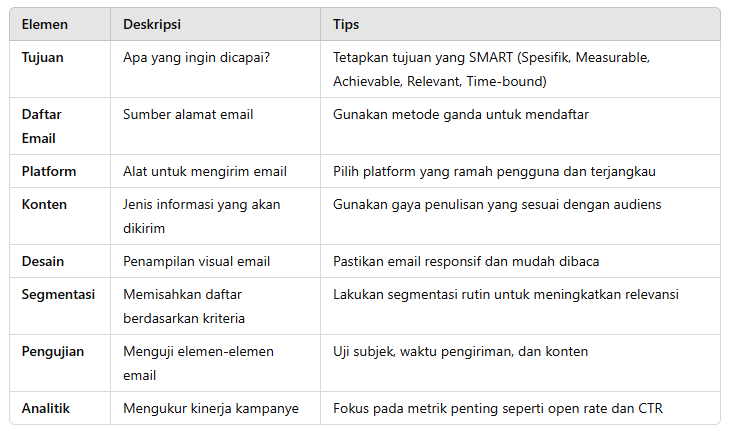 Konten email dapat berupa newsletter, promosi, dan informasi edukatif yang relevan dengan audiens. - Bagaimana cara mengukur keberhasilan kampanye email?