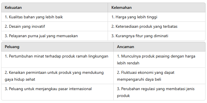 - Peluang: Peluang eksternal yang dapat dimanfaatkan untuk pertumbuhan produk.