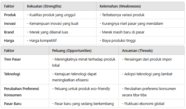 - Threats (Ancaman): Faktor eksternal yang berpotensi menghambat kinerja bisnis.