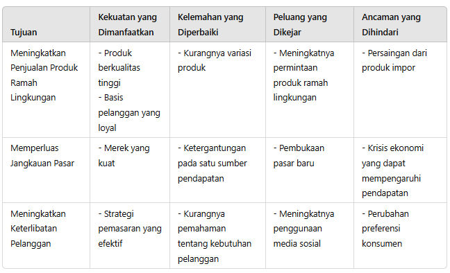 Dengan menggunakan tabel di atas, UMKM dapat secara jelas merumuskan tujuan yang terkait langsung dengan hasil analisis SWOT yang telah dilakukan, sehingga dapat mengambil langkah-langkah strategis yang lebih terarah.